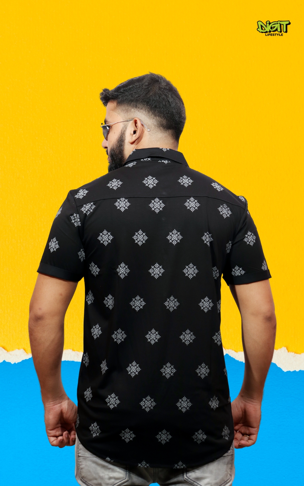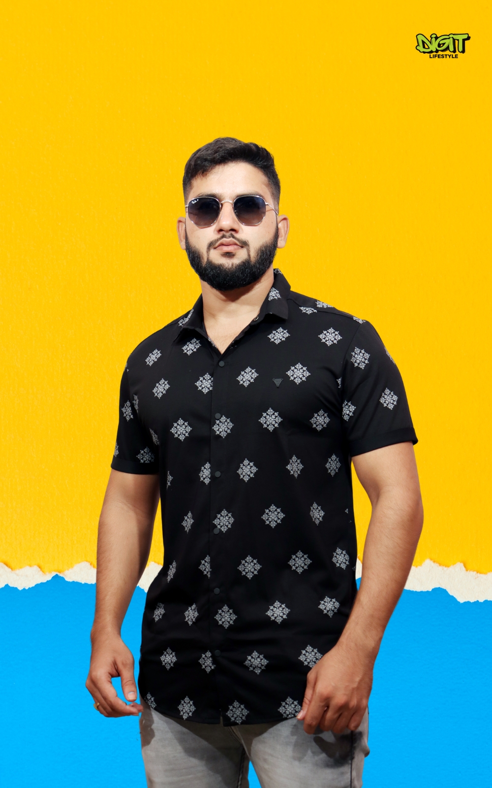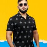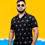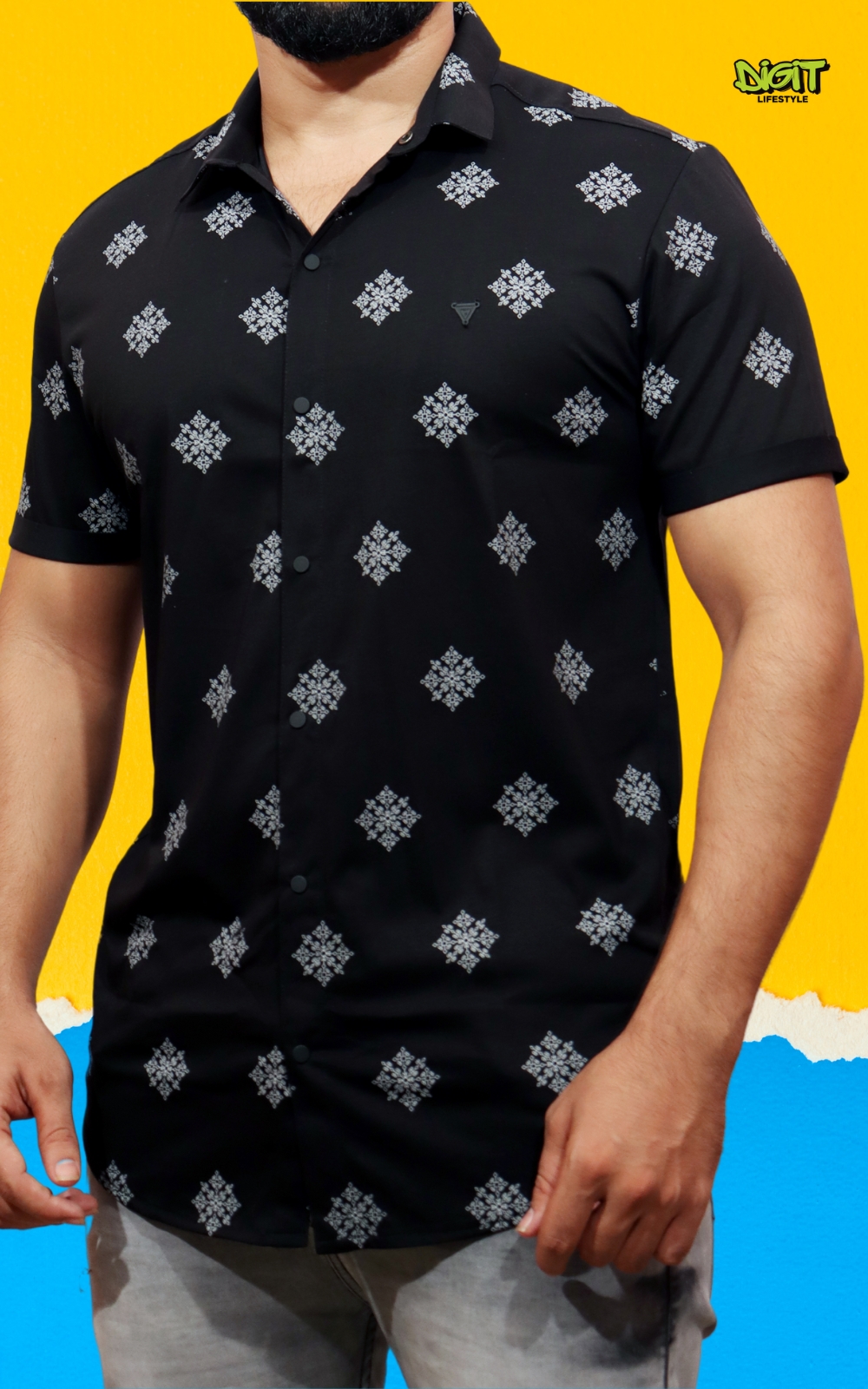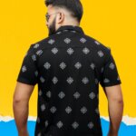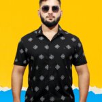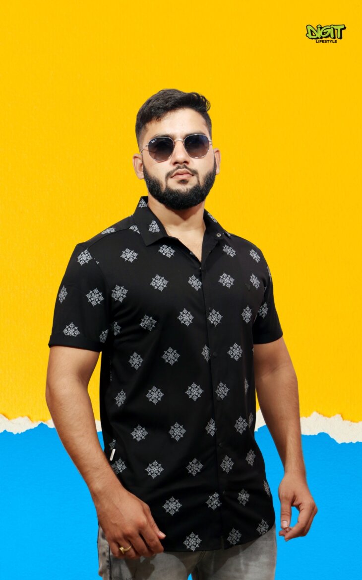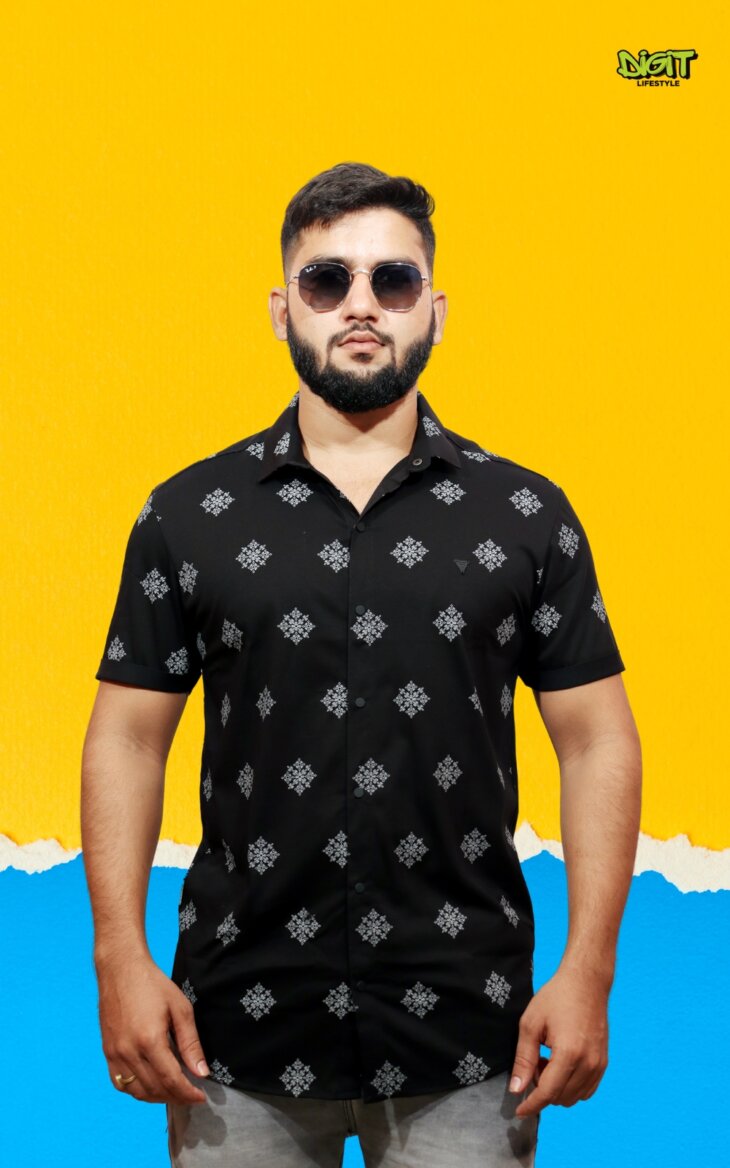 Make a bold black impression with our Geometric Floral Print Shirt, where vivid patterns intertwine in a striking display of modern elegance. Impeccably tailored, this shirt adds a bold touch to your style with its unique blend of geometric and floral motifs.